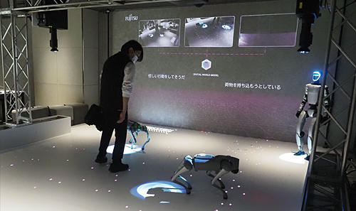 CES2026では、複数の空間カメラと犬型の警備ロボットに搭載されたカメラを組み合わせて空間を把握し、その場所に入ってきた人間の動作を未来予測するというデモンストレーションを行った。具体的には、警備を行う空間に人間が侵入してきた場合、そこに不審なものを置こうとしていないか、といった動作を未来予測し、その場から離れるよう四足歩行型のロボットが警戒の動作を行うほか、壁面のプロジェクター映像にその場から離れるよう警告を表示する。