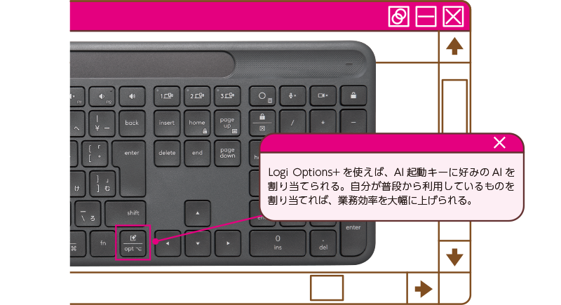 最近ではAIを活用するケースも増えているので、その際にいつも使うAIを即座に開けるかどうかは、キーボード選びの重要なポイントになる。ビジネスでの活用を考えたときに、充電や電池交換のストレスを解消し、Logi Options+によりカスタマイズが可能で、快適にタイピングできるK980は、とても魅力的なワイヤレスキーボードになる。