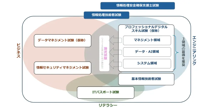 再編の大きなポイントは、応用情報技術者試験と高度試験群を統廃合することだ。高度試験は、プロフェッショナルデジタルスキル試験(仮称)とし、マネジメント領域、データ・AI領域、システム領域の3つに分類する。ITパスポート試験と基本情報技術者試験はほぼそのままで、ユーザー企業向けの試験は情報セキュリティマネジメント試験と新設されるデータマネジメント試験(仮称)に整理される。