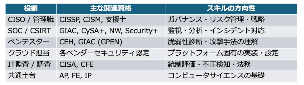 セキュリティ業務について、以下のような役割や機能に分けて、どの部署ならどの資格が適しているかを考える。その上で、要求されるスキルレベルの参考、人材配置の参考にするとよい。
