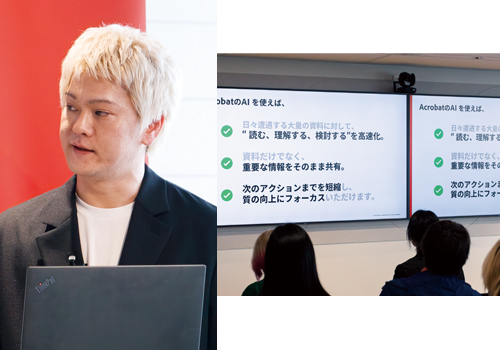次に「Adobe Acrobat」(以下、Acrobat)の進化の方向性について説明したのは、アドビ カスタマーマーケティングマネージャー 原 渓太氏。原氏は「ビジネスシーンのデジタライズが進んでいます。皆さまもデジタルの資料を扱う場面が非常に多くなっているのではないでしょうか。しかし、これはポジティブな側面だけでなく、ビジネスパーソンの負担の増加にもつながっています」と語る。実際、OpenTextの調査によるとグローバルで80%のナレッジワーカーが「情報量が多すぎる」と感じているという。こうした負担に対して、生成AIへの期待が高まる一方で、誤った内容の解答を生成することに対する懸念や、機密情報を生成AIに読み込ませることに対するセキュリティ上の懸念を抱えるビジネスパーソンも少なくない。