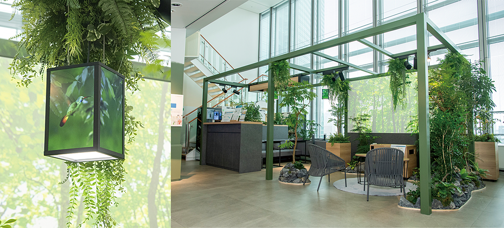 また、温熱や空気環境も、テクノロジーによる課題解決を図っている。worXlabの空間は「空間見える化ソリューション」によって常に混雑度と温湿度などの環境計測が行われているほか、換気や気流、調湿や除菌などによる空気質コントロールによって、快適性の高いオフィスで働ける環境を整えている。また湿度のムラや空気のよどみなどが発生する場所に対しては「スポット気流」というデバイスでスポット的に自然な風を送ることで、穏やかな環境でリラックスしたり執務を行ったりする環境を整えている。