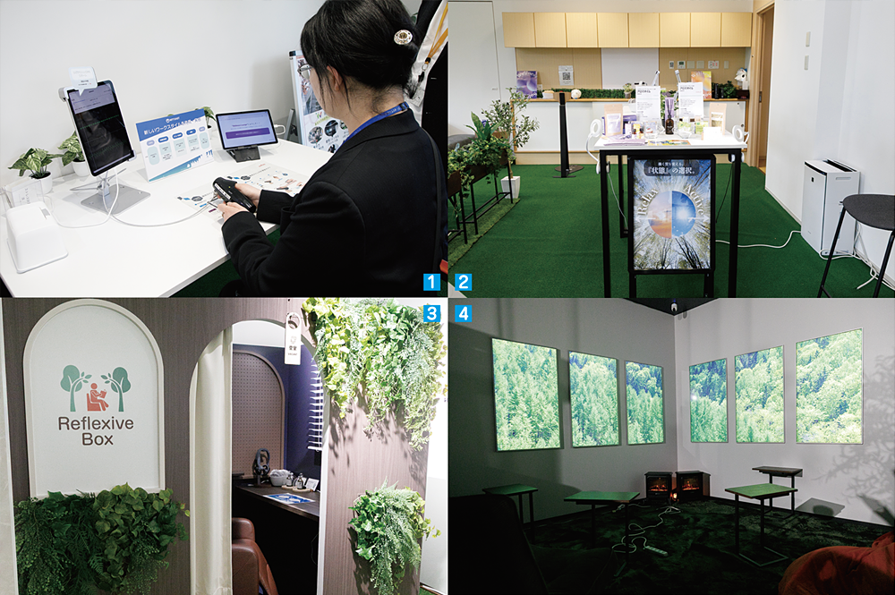 覚醒をテーマにしたHINATAエリアは、普段は予約制のミーティングスペースとして活用されている。以前と比べて大きな違いは、個室タイプの「Reflexive Box」が設置されていたことだ。濱崎氏は「Wellness Loungeのような空間を一般のオフィスに取り入れるのは、建物の施工などもありなかなか難しいのが実情です。より気軽にWellness Loungeのコンセプトを取り入れるために、テレワークボックスのような個室空間で、従業員が休息したり、アロマやニューロミュージックでアクティブとリラックスを切り替えたりするような活用が可能です。天井が空いているので、消防法にも配慮した設計となっています。例えばコールセンターのオペレーターの休息時間に活用してもらったり、この空間で仕事をしてもらったりするような活用を想定しています」と語る。疲れにくいリラックスした環境で仕事をすることで、仕事をしながら疲労度を低減できる効果を狙っている。